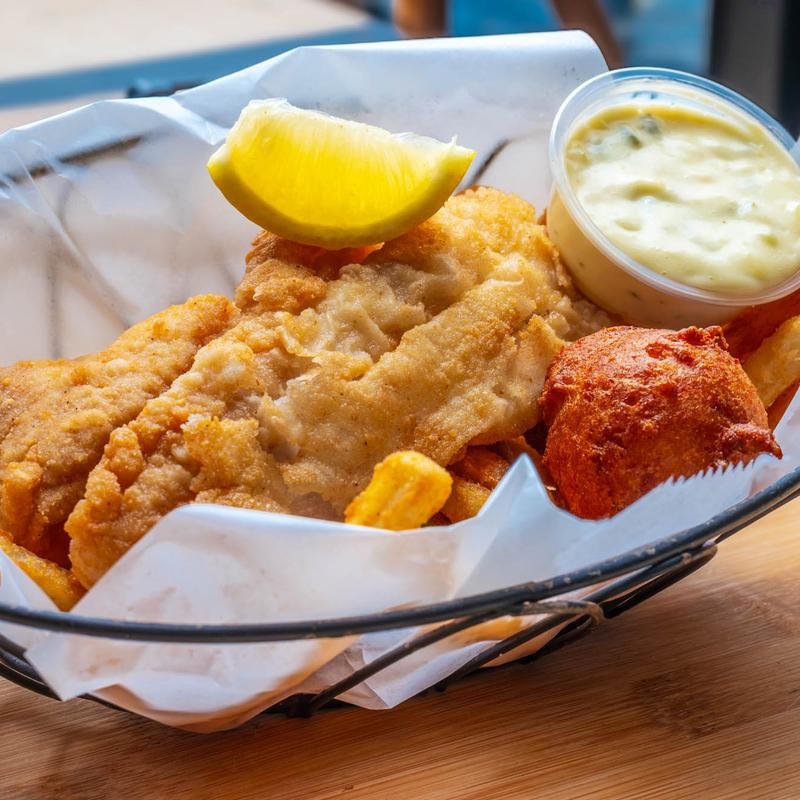 Includes hush puppies, one side, and Fish Camp Fixins Bar and Bakery.